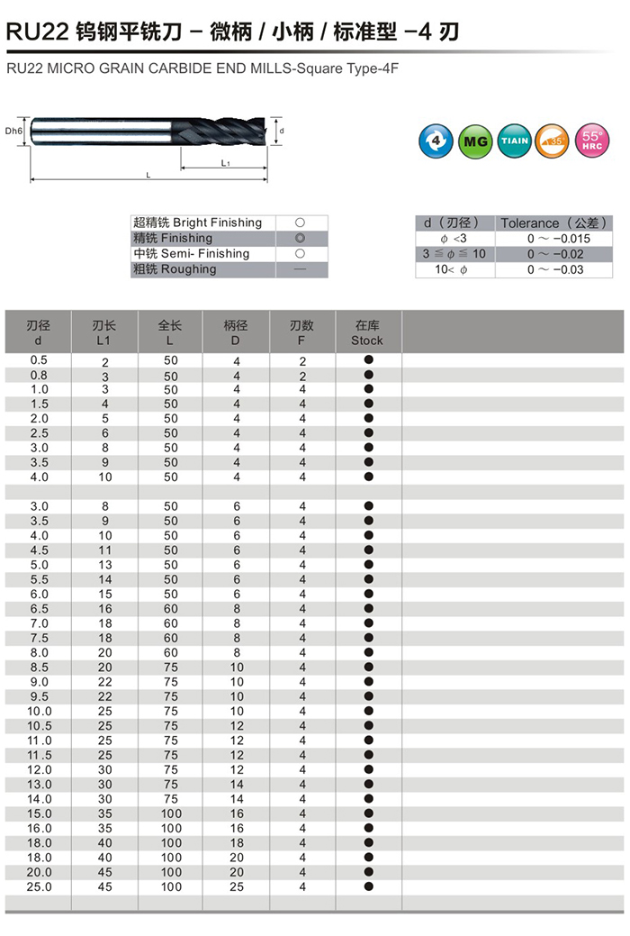 RU22钨钢平铣刀-微柄/小柄/标准型-4刃