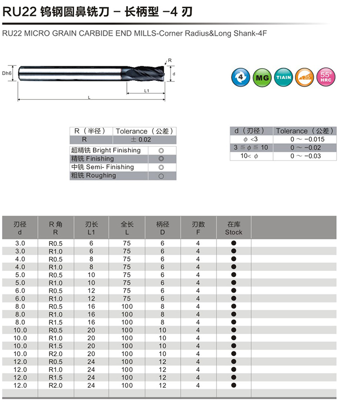 RU22钨钢圆鼻铣刀-长柄型-4刃