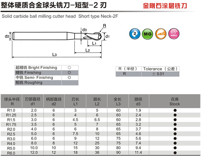 整体硬质合金球头铣刀-短型-2刃