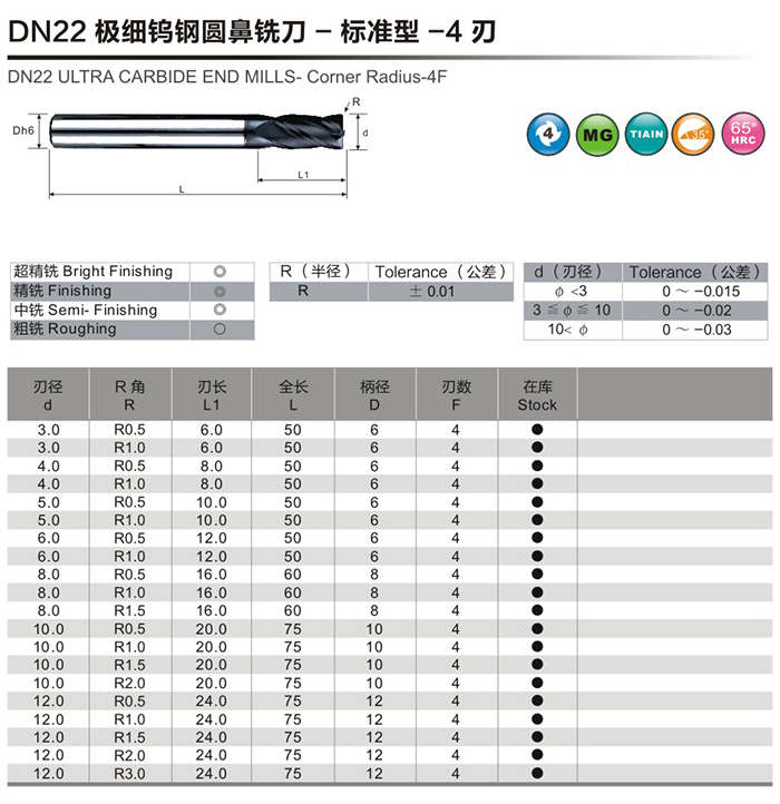 DN22极细钨钢圆鼻铣刀-标准型-4刃