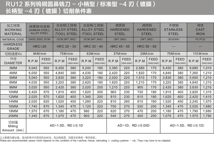 RU12系列钨钢圆鼻铣刀-小柄型/标准型-4刃(镀膜)